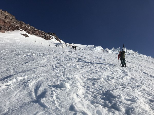 Sun-up as we gained the edge of the upper Nisqually Glacier. There was one more steep section that required negotiating some crevasses. Snow got progressively softer as the day progressed. The rest of the way to the summit crater was just a slog. First team at the summit around noon.