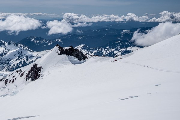 We finished the chute around 6:45am and stopped for breakfast (Brewer's Row chorizo verde breakfast burritos) next to a small melt stream visible in a hole in the glacier, with a view of where our route would intersect the Ingraham Direct route. We could see the rest of the route up to the crater. We also spotted a couple teams who had chosen the Ingraham Direct route making their way up the last grinder slope to the top. For the last couple thousand feet, Marlisa had been coughing and wheezing a little. Not enough to be alarming, but noticeable for sure. We were both feeling the sleep deprivation, but overall we were in very high spirits. We climbed to the meeting point with the ID route and headed straight up-glacier for 250 vertical feet. I could feel the rope tugging behind me, so we switched places, letting Marlisa set the pace. Another 320ft up, Marlisa stopped and went to a knee. I forced another team assessment. Marlisa's symptoms were worrying: wet cough, wheezing, shortness of breath, light headedness, and fatigue. She was having a hard time getting a full breath after moderate exertion. At this point we were at 13,220ft, having already climbed 7,820ft, with about 900 feet to go to the crater rim and another 290ft to the summit. The decision was easy, but obviously it didn't feel good. On some level you know you're not really choosing whether you should turn around or not. You already know you should, but you're deciding whether or not you should do that dumb thing that you want to do that defies logic. You put so much time, effort, energy, and desire into something like a direct ascent of Rainier, and you just don't want it to be over in a matter of minutes when you're that close to the top. We turned around.