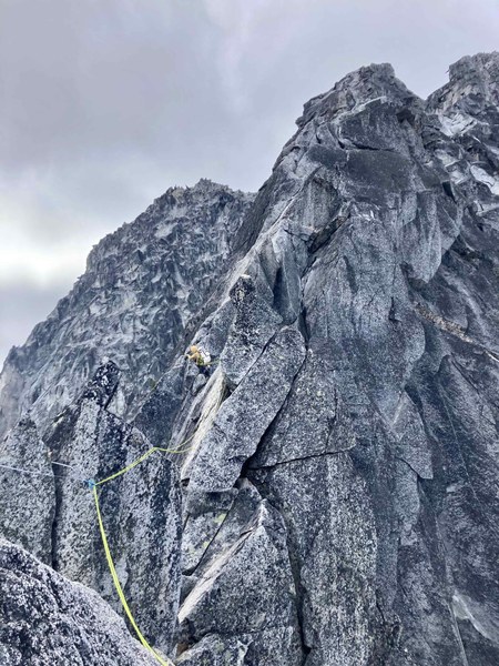 The pitch was a mixture of emotions from being tired and cold to getting a surge of energy from the sun's rays at the top. There was a tiny bit of route finding issues right after the gendarme as if you followed the ridge all the way there was a bad downclimb. We bypassed it on the right, pitched a small portion of the 5.8- step and then one simul to the summit. Completing our route around the planned time of 4.