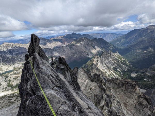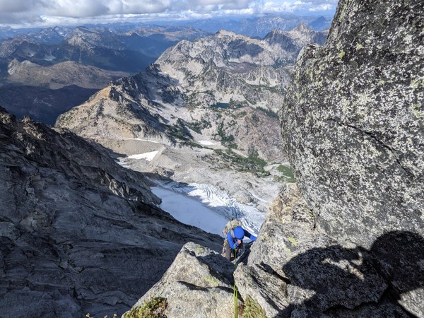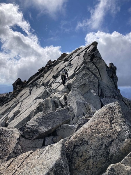 From here on out it was all simuling. Rock quality was great, with super bomber cracks and flakes. Certain places it wasn't clear to follow beneath the ridge or on the ridge directly. All I can say is once the ridge becomes very narrow just follow the ridge rather than trying to bypass it to the left or right. Some of the climbing felt harder than 5.6 but that maybe do to the heavy pack.