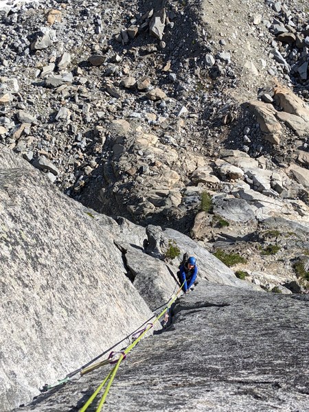 Getting to the base of the route was straightforward with fun boulder hopping and 3 sections of snow fields. Luckily the sun was unobscured, providing for some nice warm rays as we started climbing at 7:30. Just then we noticed 4 people camped at the base of the route and wondered why they weren't on the route before us. I was thinking about leading the 5.8 thrutch pitch with my backpack hanging on my belay loop but 3L of water, sleeping pad and other gear quickly made me change my mind. As the belay is literally right above the chimney, dropping a loop down made for a quick way to haul our backpacks. Pitch 3 was super fun, either climbing it crack style or as a layback.