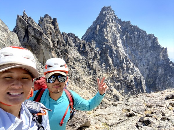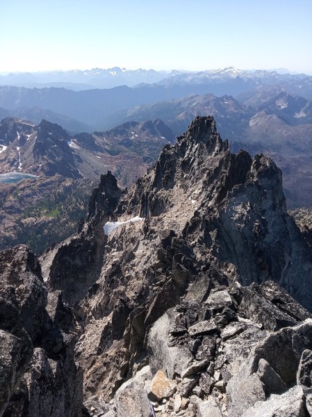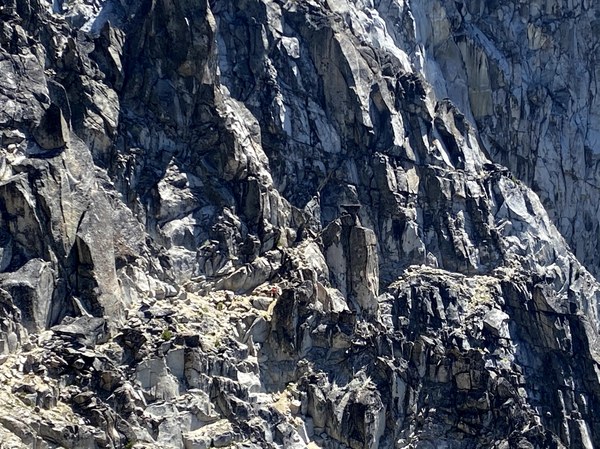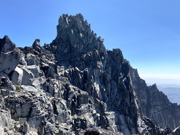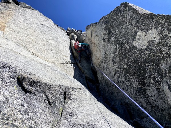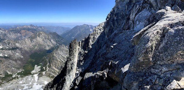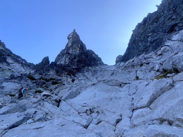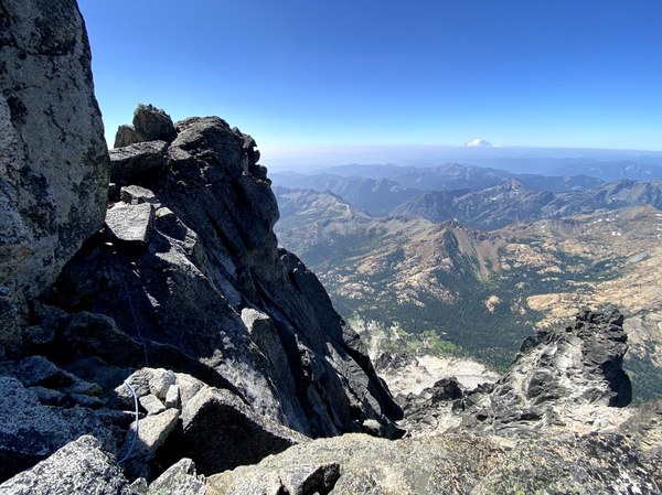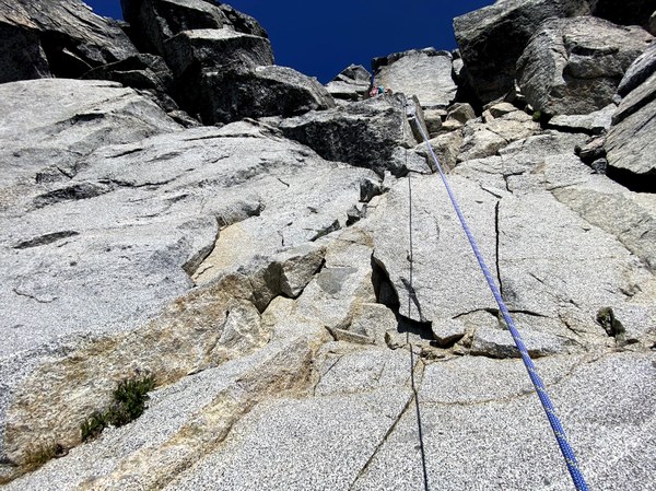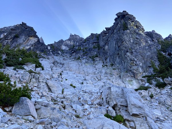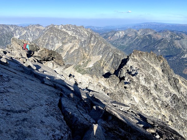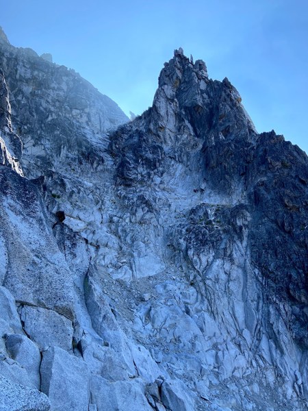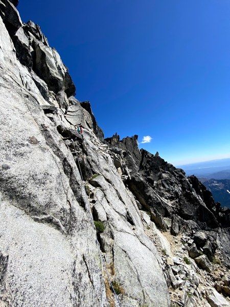 LJT looks very imposing, and the left side looked like difficult slabs. We decided to put rock shoes on and rope up and simul to get to the top. After some deliberating we took the short low 5th dihedral just right of the slabs (which are supposed to be 4th, but looked quite spicy). As we were climbing we met our first free-soloist (Aaron?), a man who had climbed Mt Stuart probably a million times (He said he climb the North Ridge every year. These are life goals). He confirmed that the way across the West Horn was towards the top. I tried listening to his summit block beta, but got too confused at that point.