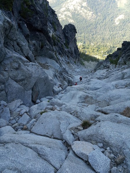 Trail to Ingalls Lake and down Long's pass are very smooth. Lower Cascadian Couloir is quite terrible. The only snow on the route is 100ft below the summit and the top of Cascadian Couloir