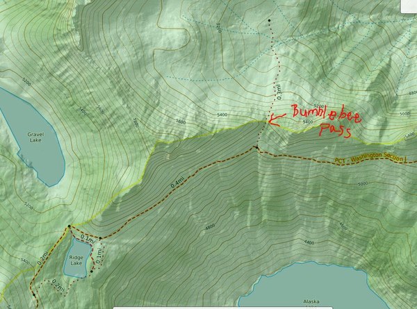 Bumblebee Pass is a small saddle above Alaska Lake, and it's about 0.5 miles past Ridge Lake where there is camping and water. We took the obvious climber's trail up and over Bumblebee Pass and then dropped down (north) into the basin directly in front of Mount Thompson. The climber's trail was pretty rough/primitive with some loose material. Be careful with your footings.