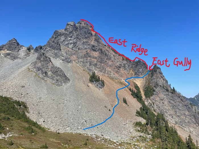 Once you get up and over the east gully, the scramble along the East Ridge was mostly on a well-established climber's trail. Do expect some class-4 scrambles at times. The most technical part of the route was the chimney that is roughly 20 feet away from the top. It was definitely a class-4 scramble up the chimney, but the handholds and footholds were solid.