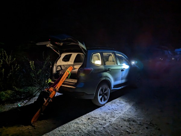 I arrived the night before the climb and bivied at the trail head (actually about 0.8 miles from the trail head as the road was still blocked with snow. There were a large number of cars parked along the side of the road, probably 10 other folks bivied and 50+ additional cars from folks already up on the mountain. The road was crowded and a van got stuck in a snow bank on the side of the road right after I arrived trying to turn around - fortunately the sheriff showed up and helped them out with a winch.