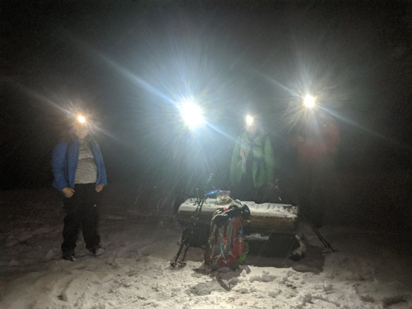 After some treats and photos, and in better spirits, we began our descent, noting that the trail had become slightly more precarious with additional water, mud, and slippery rocks. Unfortunately, one of our members took a fall on the way down due to an inconveniently placed branch, but was quickly back up on their feet. While we had noted that the headlamps and flashlights were doing a better-than-expected, if not great, job of illuminating the trail, we noted that the angle of the headlamp was key to illuminate the trail immediately in front to prevent any other mishaps.