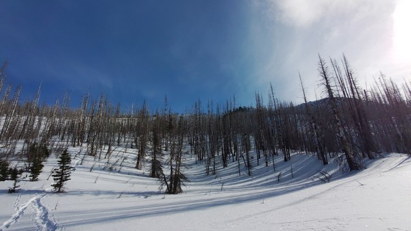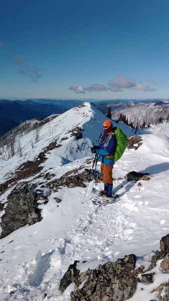 On the ridge, there were some cornices, all stable, with intermittent bare rock, making walking the ridge a bit tricky with snowshoes, especially when routing through the treetops.