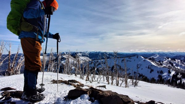 The snow was constant from the gated FS road, all the way up to the ridge, with easy travel in the slightly packed, crisp, powdery snow. At about 6100 feet we finally tired of irregular post holing and donned snowshoes.