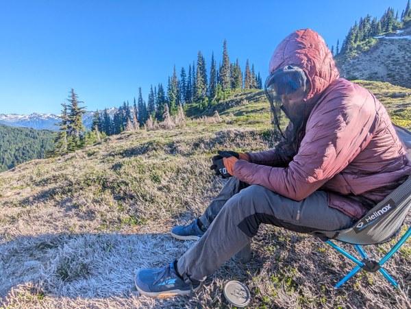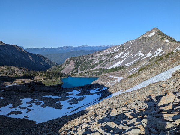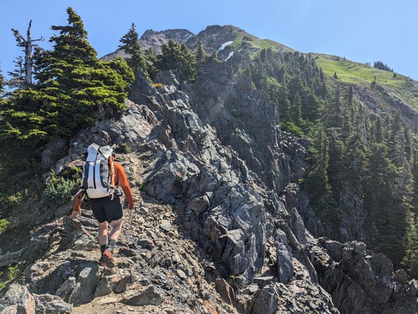 In the evening we hiked a little bit further down the trail to watch the sun set over Olympus. While admiring the view we saw a person approaching—the first other person we had seen since leaving camp that morning. It ends up it was a lady staying at Bruce's Roost, on the other side of the ridge, who had come over to check out Swimming Bear Lake. We exchanged pleasantries. As she walked back to her camp we said our goodnights to the last other person we'd see for the next three days.
