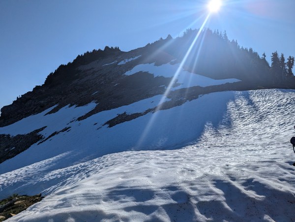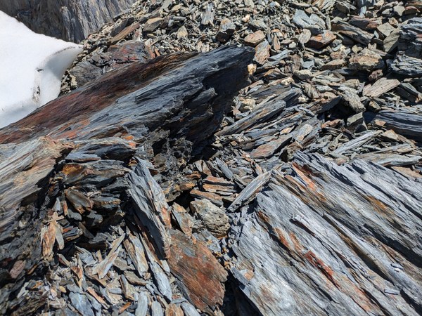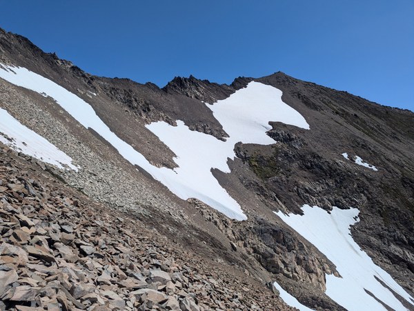 With more trudging we worked our way up to the scree fields on the upper slopes of Carrie and did the upward scree traverse over to the summit. Another pro of it being early July, we were able to bypass at least a bit of the scree on some snow still holding on.