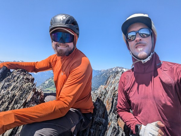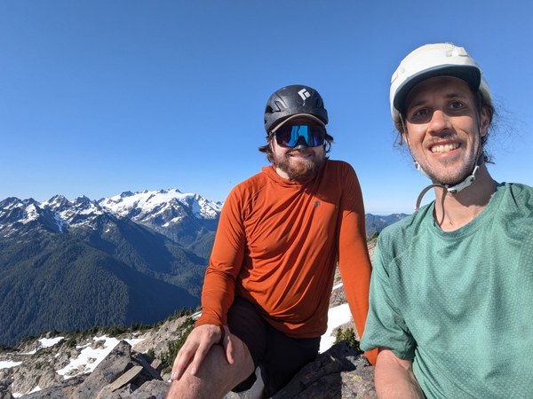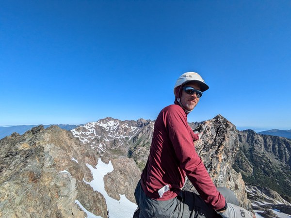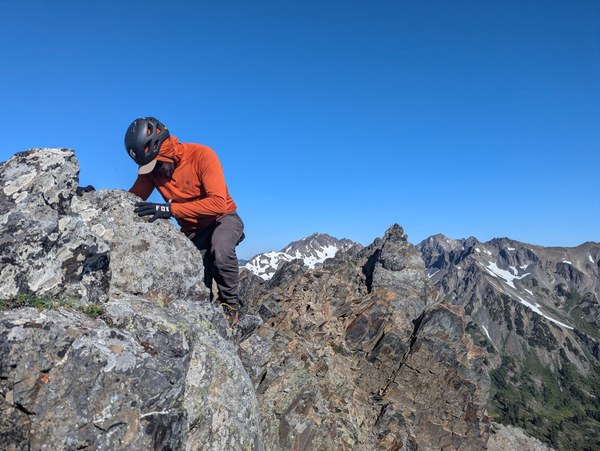 The snow took us to just below the summit block, where we transitioned back to boots and scrambled up the loose and sharp Olympics rock to the summit. Out of the four peaks we summited on this trip we agreed that Stephen was the most scrambly. Stephen was also the only peak with a summit register, however the notebook is waterlogged so we did as everyone else has been doing and signed the summit register PVC pipe instead.