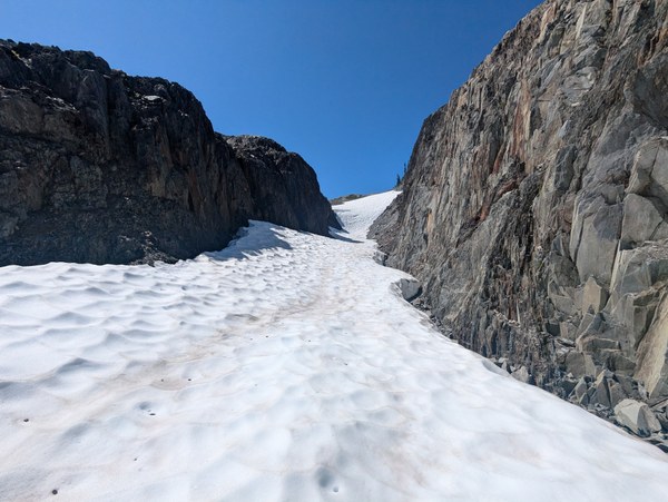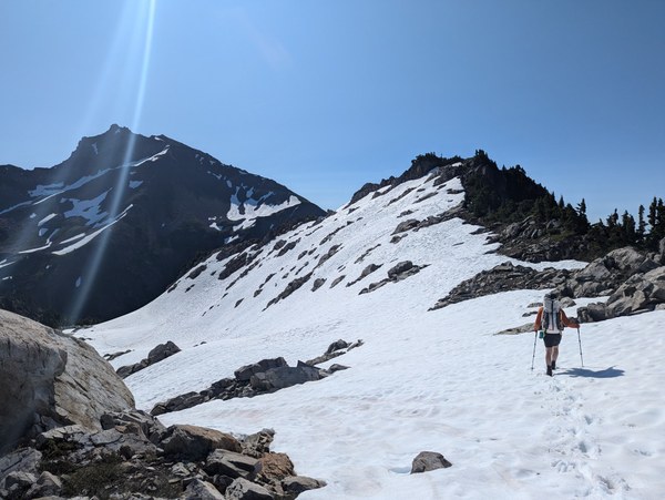 Swimming Bear Lake is an unmarked campsite in the shadow of High Divide-Soleduck Park that served as a perfect jumping-off point for the traverse portion of the trip. We escaped the hot sun by taking a dip in the cool lake and admired the stunning views of Cat and Carrie, our two objectives for tomorrow.