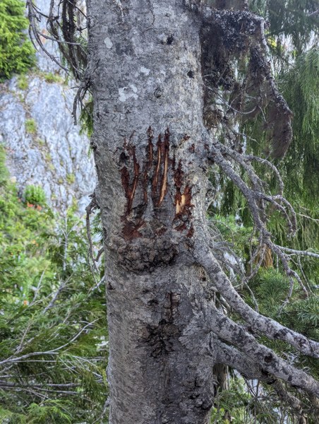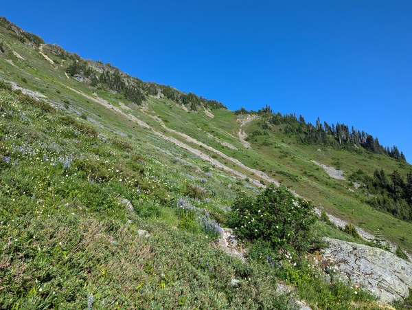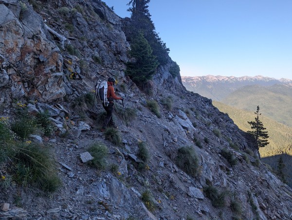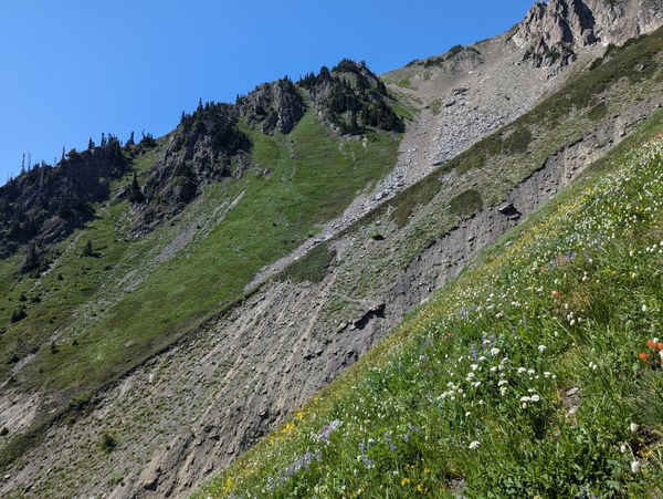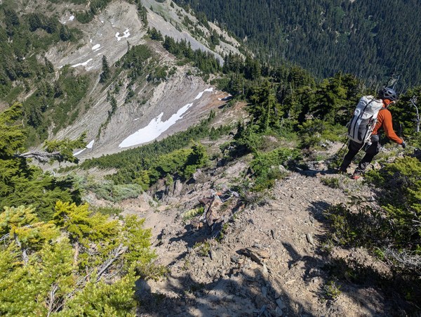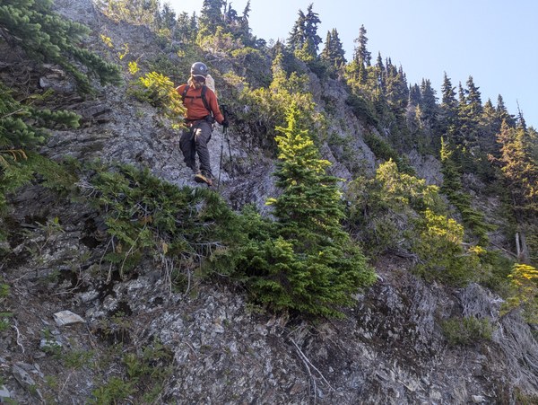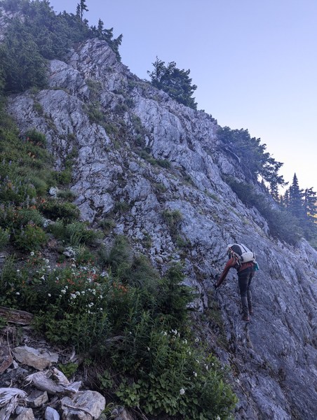 For Day 3 we continued along the trail to Cat Peak and enjoyed the trail, knowing that it would eventually peter out. We walked along the ridge, enjoying the sunny weather and wildflowers until we hit the SW ridge of Cat. Here we left the trail and continued up towards the summit. As we went, the trees got denser, the game trails got more disconnected, and the blowdowns increased.