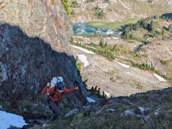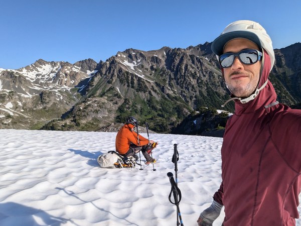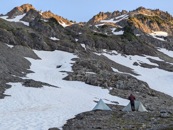 Getting to Stephen Lake you see the saddle you're aiming for for what seems like forever, with it barely getting any closer. We compared it to getting the first view of the Camp Muir huts on Rainier which give you hope until you keep on ascending for another hour without arriving there. But eventually we did get up to the saddle, continued higher up on the ridge, and once we got all the way over the ridge we were stunned at how spectacular the view of Stephen Lake and Stephen Peak is. This was one of the most beautiful places I've been privileged to camp at, and we congratulated ourselves on making the call to push on.
