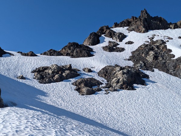 Eventually we emerged above the treeline with a few more scratches on us than we had before and traveled along some snowfields and scree to the rocky summit. First summit of the trip down.