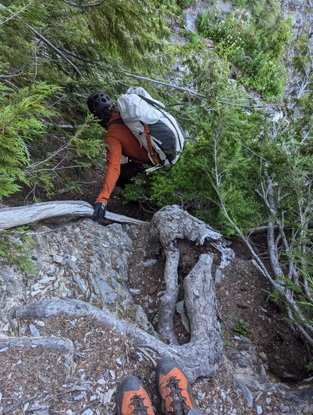 With Tim leading the way he got us to Crisler's Ladder—the series of roots acting as a ladder that allow you to ascend/descend a key gully that makes the Dodger Point route possible.