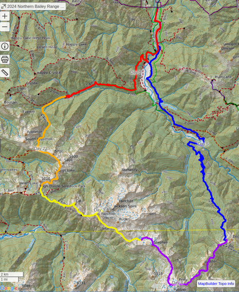 The plan was to do the trip over five days with a sixth day built in as a contingency. The contingency day was because I wanted to tag five peaks (Cat, Carrie, Stephen, Ferry, and Dodger Point) along the way and wasn't sure how much time that would add. In the end we tagged four peaks over five days, eschewing the contingency day.