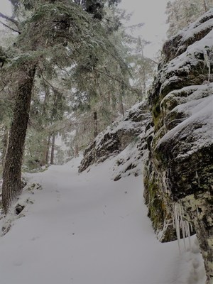 On trail at 10:05, 45 degrees and a light dusting of snow when I stepped off. Made the mistake of going to the right on the Trail of Shadows, so got to do the scenic route until it met up with the Rampart Ridge Loop. The scenic route is worth checking out if you have time. I passed two groups on the switchbacks and then was walking on fresh snow the entire route until it met with the Wonderland Trail. Lots of animal tracks in the fresh snow, I was able to make out rabbit, squirrel, and 3-4 deer that used the trail for about a quarter mile. The snow was only a few inches deep on the switchbacks, didn't really need my snowshoes until the top of the ridge. Even with the fresh snow the trail was easy to identify. It was cloudy with brief patches of blue the whole time, only caught a brief glimpse of Mt. Rainier's shoulder at one point.