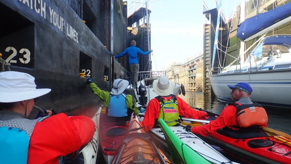 How to paddle through the Locks: it's free. Double-check the Hiram M. Chittenden Locks website to make sure both small and large locks are working. If they are most boats, including kayakers, go through the small Lock. Kayakers need to be close to, but not in front of, the Lock opening. It's a waiting game. Lock personnel will call out to kayakers when they're ready for us. The small Lock has floating side walls with bollards. So, kayakers will be asked to raft up with the one closest to a bollard holding on to the bollard by hand or rope provided by the kayaker. Holding on with one hand is usually good enough. Once the lock opens there's usually minor water turbulence either from the water levels equalizing or from boats motoring out. Not really a problem. Just paddle. I've never gone through the large lock. That is usually used for gravel barges or really large boats. The large lock doesn't have floating side walls. Not sure how they would handle kayaks as the water level changes because during that time the water in the lock sloshes around a little. The overflow weir (for lack of a better term) is next to and south of the small Lock. Be mindful of it while waiting to be called to enter. It can flow pretty good through there if there's a lot of water on the freshwater side. Likewise, on the salt water side, water can get a little messy for about 50 yards past the weir. On this day there was no water overflow being late in the season.