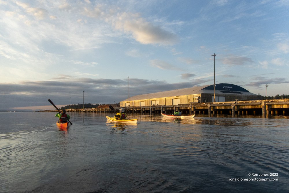 Paddling along the Port of Olympia dock. No vessels at the moment. On the far end before rounding North Point, we saw a Harem of harbor seals hauled out on logs between old pilings. We did not cause them to break into the water, we stayed outside of the pilings, but during our post trip discussion, it was brought up we should have given them more space. Future trips should stay seaward of the pilings as we did, and ideally 100 yards out.