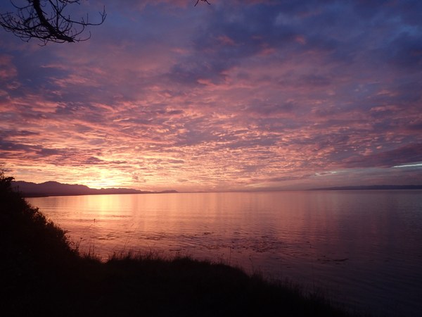 After a nice and leisurely paddle on a 270 heading against a barely noticeable ebb we arrived back at Cline Spit boat launch about 1545. The tide moves rapidly in this shallow area so it was a very short and easy haul back up the beach with our boats and gear. A very kind and much taller than me man helped Gabby get her boat back on her car; mine is easy on my Honda. We got everything loaded up and our clothes changed and headed back to our campsite in warm sunshine at the Dungeness Spit Rec Area ($40 a night, another $10 for a second car) for dinner, a walk with another beautiful sunset and a great campfire afterwards!