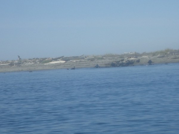 It was about 1400 before Gabby and I headed back to our boats after a visit to the neat and clean restroom. We decided to proceed the half mile to say hello to the wildlife at the end of the spit. Unfortunately it only takes one seal to get all the others in or out of the water in spite of the distance we made sure to keep away from the shore. As usual the birds stayed and screamed at us as we rounded the point in the quiet water to see the barely whispering waves along the shore to look down the Strait to the western tips of Washington state and Vancouver Island and the open Pacific Ocean between them. I have watched the water looking black with menacing waves pounding the jetty at Ediz Hook on a cold winter day in February and the contrast is just amazing.