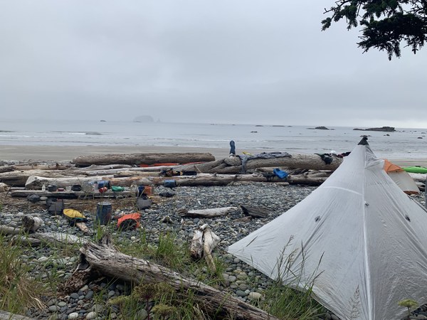 There are two camp sites here: Ozette North and Ozette South. Both are quota with limited number of people permitted each night. We stayed in the south camp. Land on first beach south side of the river. Ascend the clear trail to an open forested campsite with multiple tent sites on pine duff. Latrine present but “full”.