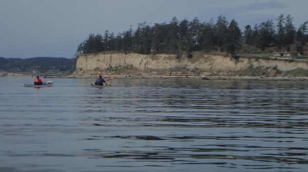 The plan was to either paddle to Windjammer Park at Oak Harbor or circumnavigate Penn Cove, depending on the conditions we see at Saratoga Passage. The four of us launched from Captain Coupe’s boat launch in Coupeville at 10:07 am. Since the light winds were from the west we paddled eastward toward Long Point. At Long Point we turned north. Right about here is the entrance to Penn Cove from Saratoga Strait. Winds were now from the south. About 1/2 way across towards Blowers Bluff we experienced 1+ ft swells. Those conditions looked like they extended all the way up to Oak Harbor. I decided to turn back and circumnavigate Penn Cove. Found a quieter spot to land further inland in the cove and had lunch.