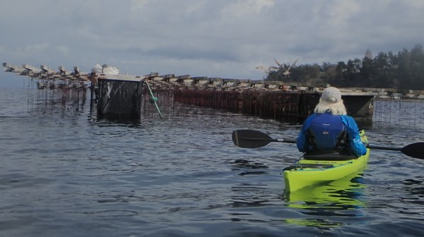 After lunch, we continued westward following the perimeter of Penn Cove. Winds were now light from the east (tailwind) and water was either calm or light ripples. At the southern portion of Penn Cove and west of Coupeville is the mussel growing/harvesting operation. This was really quite interesting to check out (pictures attached). Closer to Coupeville a couple of the paddlers harvested mussels from the piers at the Coupeville waterfront. They live close enough to put them on ice fairly soon. They quickly realized they could have harvested closer to Captain Coupe’s boat launch. But one must be watchful of what’s flowing into the cove around that area.