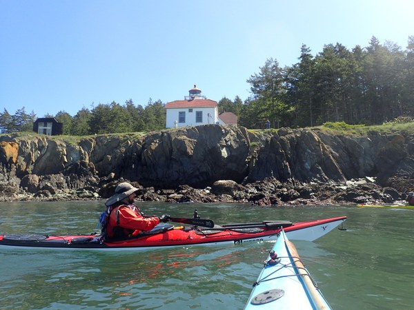 We had a short huddle since most of it had been covered in the itinerary and emails. We launched a little late at 0915. Alia told me before we launched that due to her minimal experience in Deception Pass she was hoping to go through at slack. We got out of the marina area, completed a radio check and I noticed some people coming down the cliffs on the headland. Then it was whipped around the point and into some eddies and chattering water to get into the current that was building fast and would push us over to Washington Park. We pulled out and some went to check out the new bathroom that replaced the Honey Buckets on the east side of the park. Then it was back into our boats to continue on in the rippling water on to Green Point and around Fidalgo Head. There wasn’t much action in the water or on it. There were a few distant kayakers that went into Burrows Bay while we continued on to Burrows Island. There was a crane outside one of the buildings at the lighthouse and we were surprised to see activity there. A guy came out and waved near the front. He told me that some work was going on to clean up the lighthouse; I guess it is time for its once in a decade or so cleanup.
