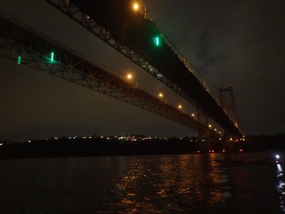 We didn’t have much space to pull the boats up but as we were at the top of the tide we didn’t have to pull them far with only some soft sand to deal with so no complaints there. We got our drysuits off and dry shoes on sitting on the benches of the roomy front porch of Steamers before going in. After a hot and very pleasant meal we put it all back on again including our lighting on ourselves and boats and took off from between the pumpkins back into the dark at 2100. It was evident by the strong back eddy just getting past all the pilings that the current was barreling along. It didn’t take long to hit mid channel and swing to the right and head for the bright lights of the bridge. Brian clocked us at 7.3 knots before we paused for pictures to be taken before proceeding on. The full moon peeped out occasionally from behind the high clouds but there was still the milky glow along with the lights on the shorelines except for the totally dark area of Point Defiance Park.