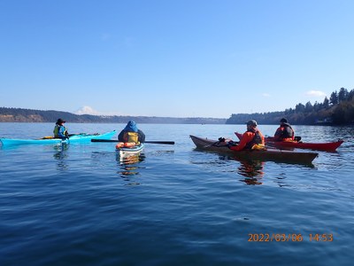 Only the lower part of the bulkheads of the Tacoma Narrows Bridge were visible from Titlow Beach when I arrived. But it cleared by the time people began arriving with everybody ready to go when we had our pre trip huddle at 1100. There were a few good questions asked and hopefully all bases covered by the time we launched at 1115. We headed straight west then turned after about 10 minutes, passing a floating tree, roots and all, en route. It took about an hour of easy paddling to cover the 5 miles to the Tides Tavern, arriving about 1215. While there was plenty of shore to land on there is no easy access off the beach to the restaurant so the dock is really the only way to access it without paddling down to the public commons and walking. Scott and Bob kindly assisted me and my recovering knee to safely get in and out of my boat at the dock. We got out of our drysuits and into some dry shoes before going into the restaurant. A table was immediately available on the heated enclosed deck. As usual we had a hot and tasty meal as we waited for the tide and current to shift, getting up from our table at 1415 and hitting the bathrooms before heading back to the boats. Now it was easy to see Mt Rainier covered from top to toe in snow as we got out of the way of outgoing power boats through the tiny entrance to the harbor. We rafted up and the decision was made to check out the tidal action at Point Defiance and headed on over. I approached what I thought was a floating log that turned out to be a tiny seal who must have been napping. She got about two feet from my boat and her sleepy eyes widened as we stared at each other for a few seconds before she dove under and was gone. There were more where that came from as the Point is a popular seal hangout and we were followed frequently as we went along. It was barely rippling at the point as we were pretty much at slack. Nobody needed to get out or wanted to go along the Salmon Beach housing so we headed through the quickening current in the middle of the channel and under the bridge. Once again the water was chattering softly directly under the bridge but smooth on both sides of it. We paused briefly for me to advise everybody to avoid the back eddy and stay outside of the cove at Titlow until ready to turn left and head straight to the pilings. Excellent and very fast teamwork was applied to get the boats up to the grassy area by the railroad tracks. Most of us moved our cars to make the loading easier. A brief post trip huddle was held with no complaints and thanks exchanged on both sides. A nice gentle Class III on a lovely winter day with beautiful scenery and good company! All paddlers performed well with excellent dynamics.