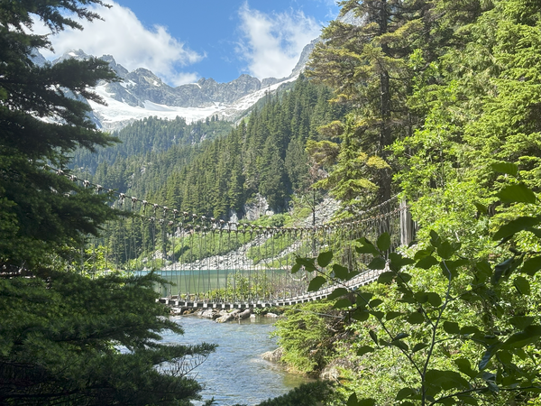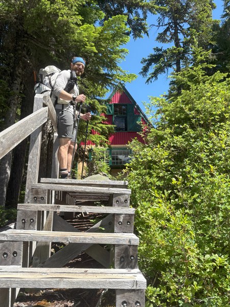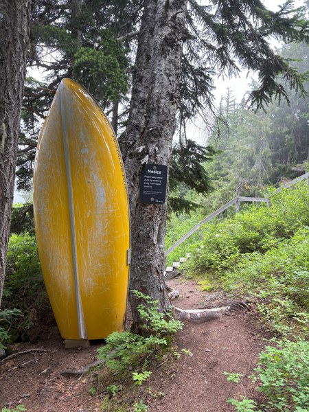 We arrived at the lake after ~3.5 hours. A small bridge connects the trail to the Tantalus Hut and main camp. No personal boats/flotation are allowed, but there are some canoes managed by the Alpine Club of Canada.