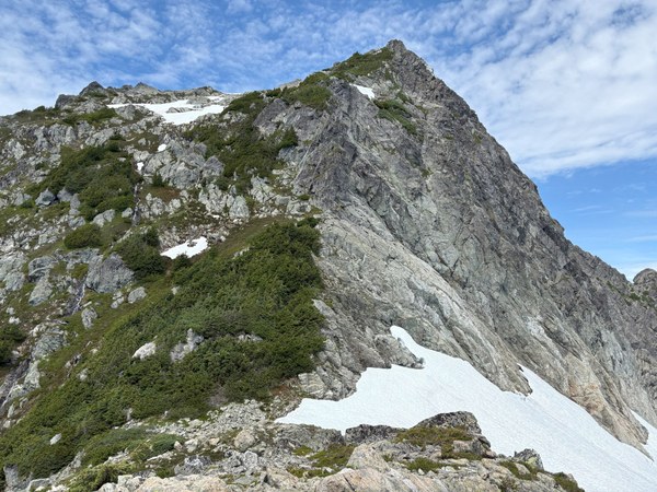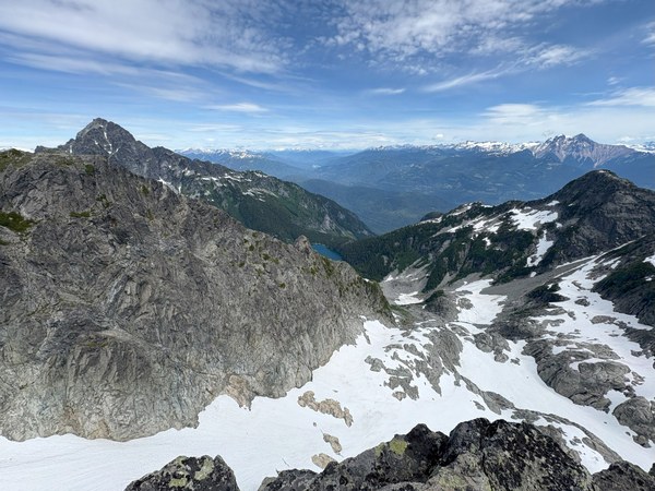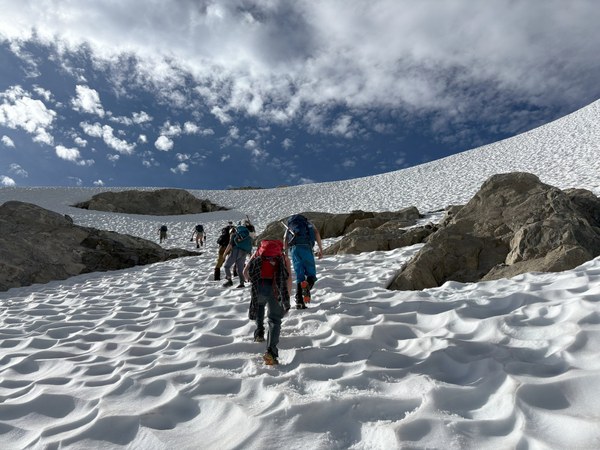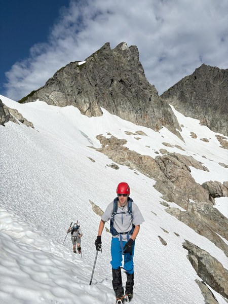 On day 2, we geared up for a scramble and headed south. The meadows is just a short distance away. It has a maze of streams flowing through it and presents the first real views of Omega, Iota, Pelops and Niobe peaks. From the meadows, we hiked up mostly rock until reaching snow. With our crampons/micro-spikes and ice axes, we crossed the snowfield and then headed up to gain the ridge. Back on rock, we eyed the peaks. The scramble up to the peaks was lovely -- no snow and easy going.