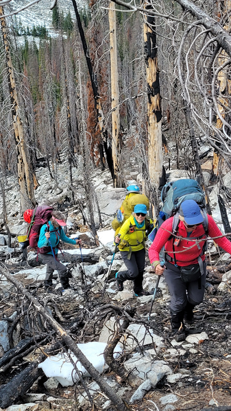 The beautiful forest and good boot path I remembered from 2015 were obliterated by the fire, with hundreds of downed burnt trees and rocky terrain as the soil had completely been stripped down in many areas. After reaching the first bench we navigated left (I remembered slide alder and post holing hell from the first time on the climber’s right side) and read of a much better approach staying climber’s left. The ascent from the first bench to the second one on climber’s left went through boulder fields and more burnt forest.