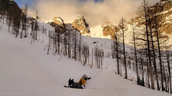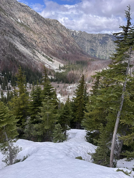 The ascent from camp to col had taken us 2 hours and the summit part (up and down) another two hours. After a short break at the col, we made a quicker descent back to camp, carefully but quickly passing by the avalanche, reaching camp at noon. We took an hour to eat and repack our gear. Since our ascent route to camp from the lower bench had not been so great, we decided to try a different route down following some tracks we had uploaded in Gaia. The first part was mellow snow in open forest. Snow was great, it was pretty and we made fast time until we reached a much steeper area in dense trees. This ended up an interesting section navigating between tree wells, veggie belaying on tree branches, but we finally found some open snow near the bottom of the valley floor.
