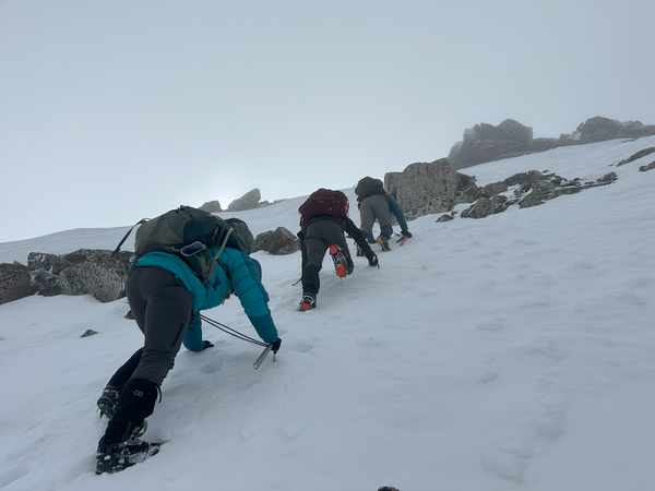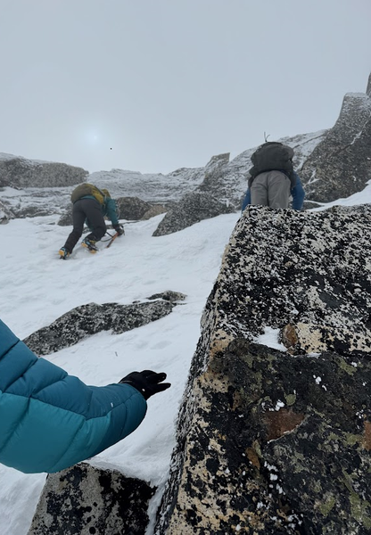 We discussed as a group whether we wanted to attempt it in these winter conditions. Everyone in the group was experienced (two climb leaders and two intermediate students) and willing to at least go up a bit and see. I think if we had any basic climbing students, we may have turned around or if we had time, set up pickets and rope up. We started far right on a short icy step. I went ahead and kicked deep bucket steps and used my slightly curved ice ax in low dagger position. It went in beautifully and I felt confident on my ascent. Once on a little gentler terrain we proceeded up on snow ramps and made a few scrambles moves on small rocky steps, then found more steep icy snow sections to front point until we reached the final section right below the summit.