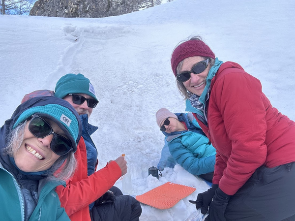 We were excited to get out of the trees, but the snow was too thin and soft, and we started post holing really deeply. At some point, all 4 of us were caught in different deep holes at the same time. We dug ourselves out except for one of us who required a little assistance (the snow was soft, but rocks were wedging her feet) and my shovel came in handy to extricate her leg.