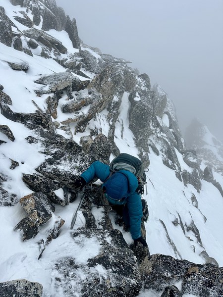 At the col it was breezy and very cold and rhyme ice was coating all the rocks. In between short moments of white-out when clouds were passing by, we saw the summit block and realized it had a LOT of snow. Completely different conditions from when we did that in early July snow- free.