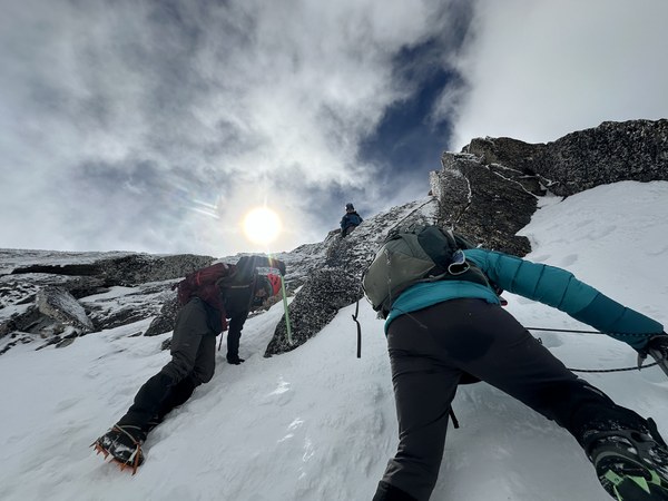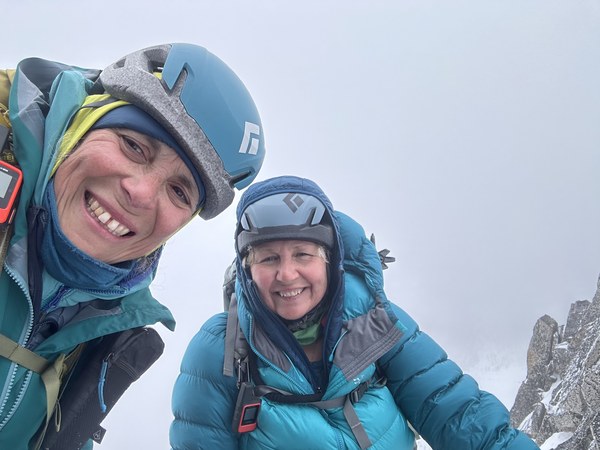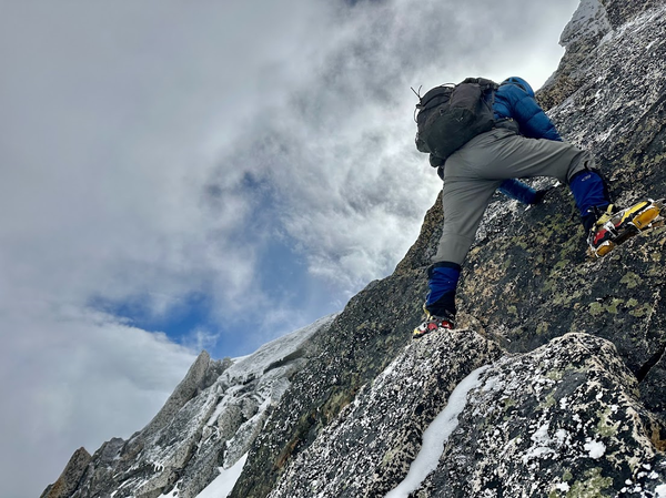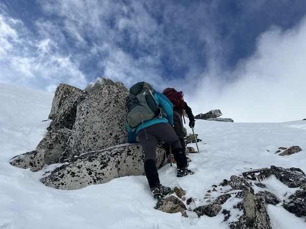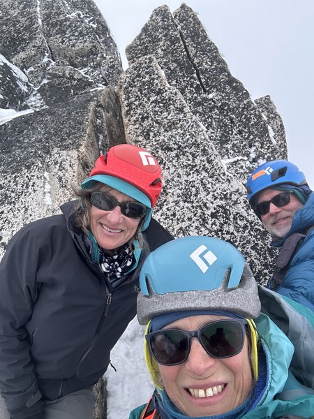 There was a narrow ledge covered by snow where all four of us could barely fit. We took turns reaching for the summit (it’s a pointy spot not a platform of any kind) and then took a couple of summit photos then downclimbed the steep snow sections back to the col.