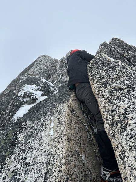 We finally spotted the final chimney and the real summit. Most of the rock leading to the chimney was filled with snow until the last squeeze chimney move.