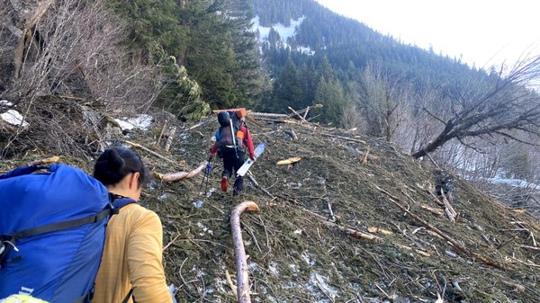 There were concerns on when the snow began but luckily we were able to park about 200m from MP 18 which currently has 3 large concrete blocks. To avoid the forecasted hot weather, we departed at 6:30am and made good progress on the road. Surprisingly we were able to skin most of the way to the Boston Basin TH, minus the few patches of dirt we just stepped over. There were some occasional downed logs but we were completely surprised when we ran into a large avy debris field coated with freshly chopped trees. This was about 400 ft wide and at least 10 ft deep.