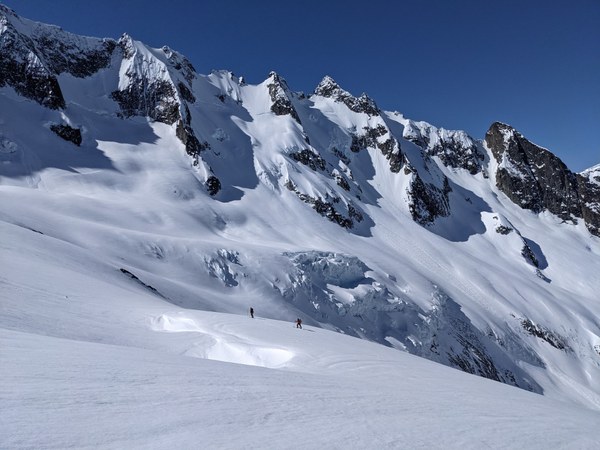- Small bergshrund forming on the col to get on to Forbidden Glacier