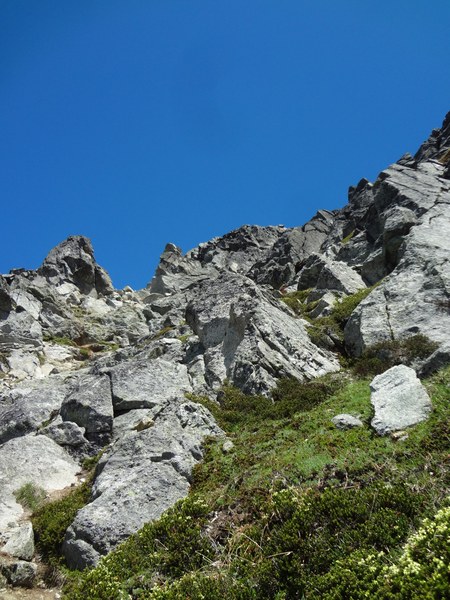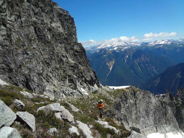 Ascend a gentle heather slope and traverse left to another wide gully. Ascend this gully, eventually topping out on it's right side at the ridge crest. Traverse left just below the ridge crest. There is one moderately exposed move where you need to hug a rock and step around it. It could be intimidating for some, but the there are bomber hands on both sides of the rock and good feet as well.