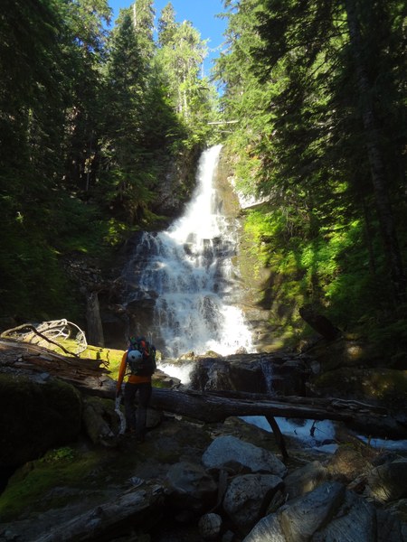 Head uphill for a short way to an old roadbed. Go left on the roadbed for maybe 50 yards to where the trail heads uphill on the right for the long climb up. At the waterfall, cross on a log and take a left (downhill) across another log to find the trail going into the trees. We lost the trail here and found it later - so look around slightly downstream after crossing at the waterfall and you'll find it.