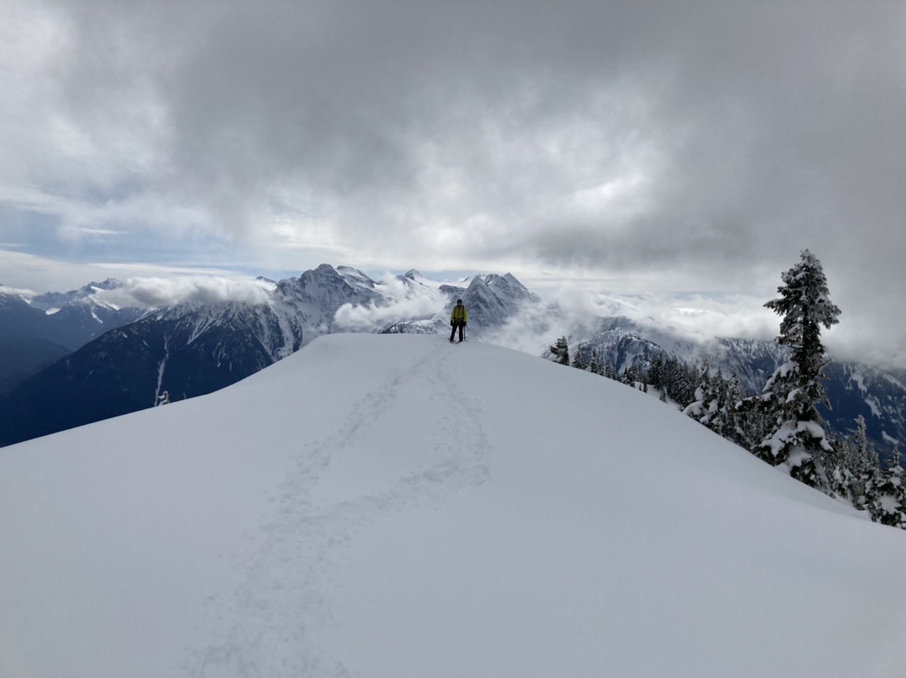 Almost perfect conditions to visit Sourdough Ridge, with the narrowing at ~5600’ amply covered by well consolidated snow. The trail was snow free to ~2700’, with conversion to snowshoes at ~3000’. Higher than normal afternoon temperatures increased our workout, with balls of snow on the bottoms of our snowshoes! As always, the huge cornice just south of the constriction motivated an approach slightly lower on the west side of the ridge: