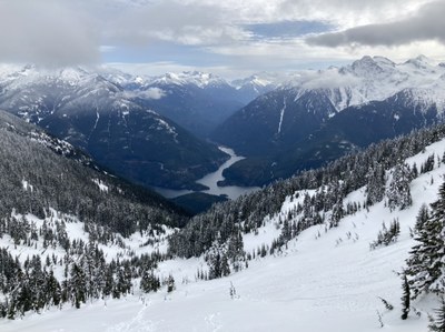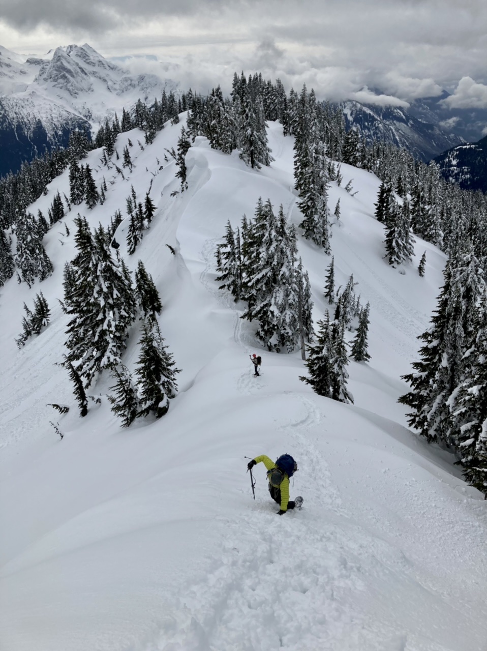 A particularly impressive area (as in “glad we’re not there”) was the natural avalanche machine on the NE aspect of Davis Peak. We heard constant slide sounds from this slope throughout the day, thanks to the sharp NW-SE trending summit ridge of Davis. This ridge efficiently squeezes snow from winter storms to form massive cornices, then with a bit of warming drops them onto a steep half mile wide slope bordered by sharp ridges on either side: