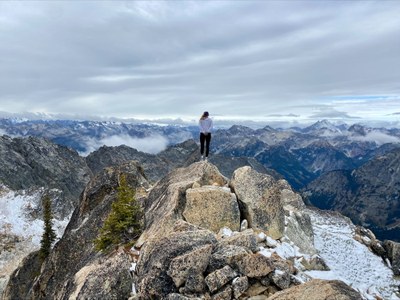 We were originally headed to Mount Bigelow but when we were driving past rainy pass it was too beautiful to not stop. The larches were golden and the first snow of the season was falling. We ran up to Liberty Bell in our trail running gear. We didn't summit Liberty Bell but did end up at the top of some saddle/col/gully. We came down and bopped over to Early Winter Spire. We looked at the south face which probably would have been doable but probably not safely with just running shoes so we looked for a different approach and found the southeast couloir. We of course had zero beta for any routes because this was not our planned trip. The scramble up was great, good solid stuff the whole way and minimal ice. Lots of climbing anchors and stuff all the way up the couloir. Made it to the top and beat the climbers coming up the south face. Took a pic and headed back down. Once back on the trail we ran out to the TH. The number of hikers and larch viewers had double by this point. From there we headed over to Frisco/ maple pass which was also swarming.