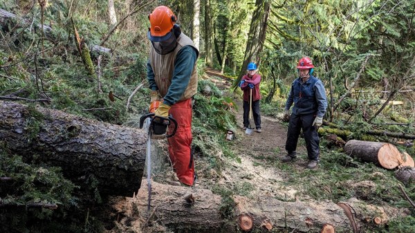 Thank you, crew members for your tireless efforts to clear the trail at Tolmie State Park today. I am feeling very good about our successes because the entire trail system is now free of hiking obstacles that the heavy weather brought down. A huge credit for this belongs to Mike Forsyth Chainsaw Leader and Ginger Sarver Crosscut Saw Leader Crew. In part because we completed our mission, open the trail and remove all the obstacles for hikers.